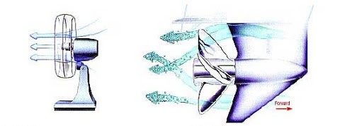 This pressure difference pulls the water into the propeller and throws it behind; the principle of operation is identical to that of a fan that sucks air from behind and "throws" it forward.