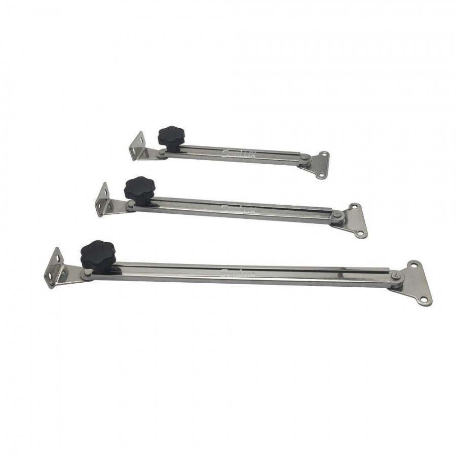 This hatch adjuster is made of marine-grade 316 stainless steel for long-lasting durability and corrosion resistance. It features a sliding rod that locks securely in place with a plastic nub screw, making it ideal for securing hatches in partially or fully open positions. A built-in stopper prevents disconnection when fully extended.