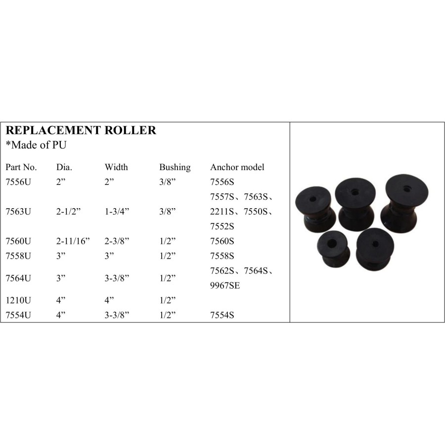 *Made of PU Part No. Dia. Width Bushing Anchor model 7556U 2” 2” 3/8” 7556S 7563U 2-1/2” 1-3/4” 3/8” 7557S、7563S、 2211S、7550S、 7552S 7560U 2-11/16” 2-3/8” 1/2” 7560S 7558U 3” 3” 1/2” 7558S 7564U 3” 3-3/8” 1/2” 7562S、7564S、 9967SE 1210U 4” 4” 1/2” 7554U 4” 3-3/8” 1/2” 7554S