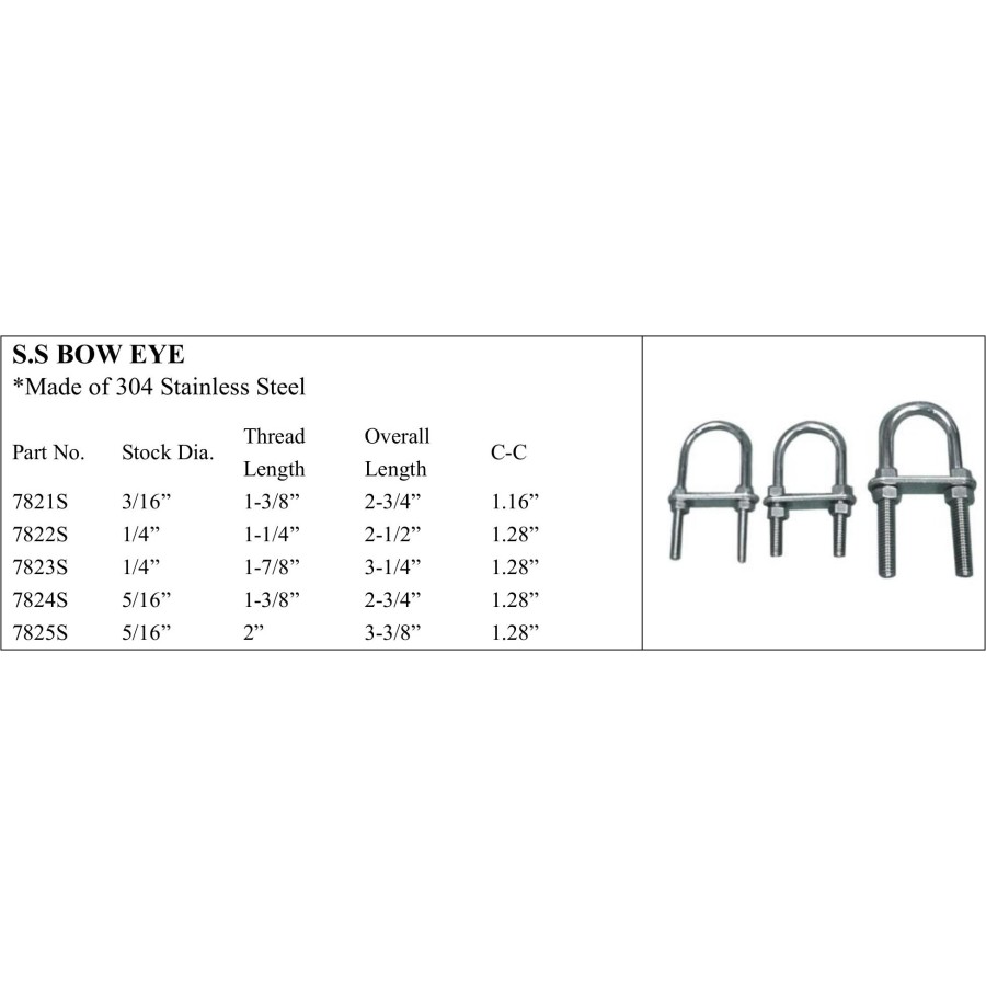 *Made of 304 Stainless Steel Part No. Stock Dia. Thread Length Overall Length C-C 7821S 3/16” 1-3/8” 2-3/4” 1.16” 7822S 1/4” 1-1/4” 2-1/2” 1.28” 7823S 1/4” 1-7/8” 3-1/4” 1.28” 7824S 5/16” 1-3/8” 2-3/4” 1.28” 7825S 5/16” 2” 3-3/8” 1.28”