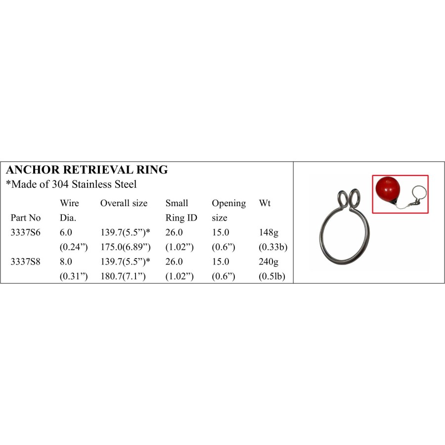 *Made of 304 Stainless Steel Part No Wire Dia. Overall size Small Ring ID Opening size Wt 3337S6 6.0 (0.24”) 139.7(5.5”)* 175.0(6.89”) 26.0 (1.02”) 15.0 (0.6”) 148g (0.33b) 3337S8 8.0 (0.31”) 139.7(5.5”)* 180.7(7.1”) 26.0 (1.02”) 15.0 (0.6”) 240g (0.5lb)