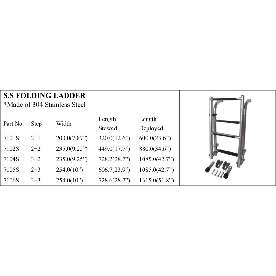*Made of 304 Stainless Steel Part No. Step Width Length Stowed Length Deployed 7101S 2+1 200.0(7.87”) 320.0(12.6”) 600.0(23.6”) 7102S 2+2 235.0(9.25”) 449.0(17.7”) 880.0(34.6”) 7104S 3+2 235.0(9.25”) 728.2(28.7”) 1085.0(42.7”) 7105S 2+3 254.0(10”) 606.7(23.9”) 1085.0(42.7”) 7106S 3+3 254.0(10”) 728.6(28.7”) 1315.0(51.8”)